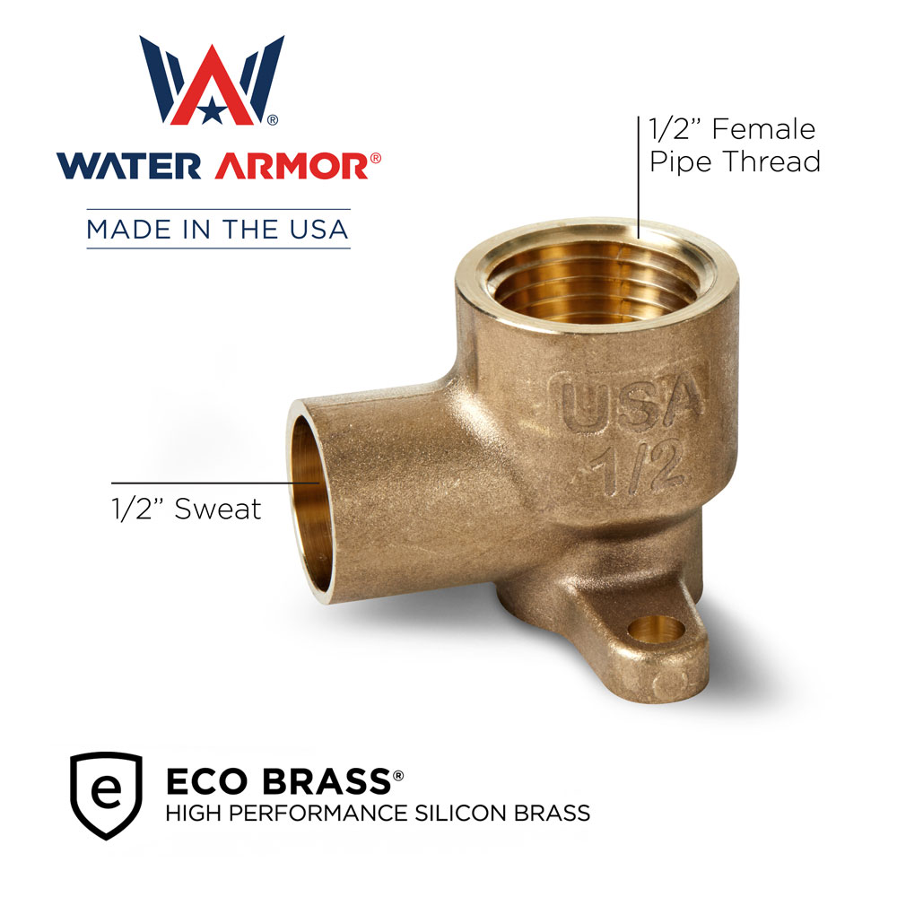MADE IN AMERICA. The Water Armor® 1/2″ lead-free* female threaded 90° sweat drop ears are made from ECO BRASS® alloy and are ideal for your plumbing projects. Water Armor products can be used for both commercial and residential plumbing installations. We are also ready to fulfill your bulk and wholesale orders. The female sweat drop ear is best used for plumbing projects that require a transition from copper pipe to a female thread, like shower heads, tub spouts, and supply stub outs. The drop ear is composed of a solder cup, FNPT threads, and two mounting ears for the fitting to be secured to a wall using screws. Our lead-free* ECO BRASS® and ECO BRONZE® alloys provide outstanding dezincification resistance and are safe to use for potable water applications in all 50 states, including California.